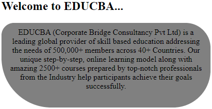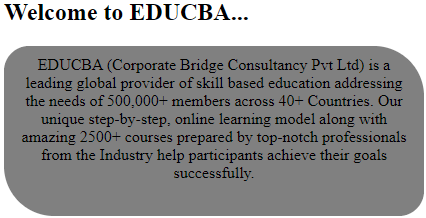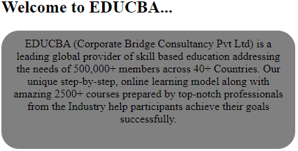 EDUCBA (Corporate Bridge Consultancy Pvt Ltd) is a leading global provider of skill based education addressing the needs of 500,000+ members across 40+ Countries. Our unique step-by-step, online learning model along with amazing 2500+ courses prepared by top-notch professionals from the Industry help participants achieve their goals successfully.