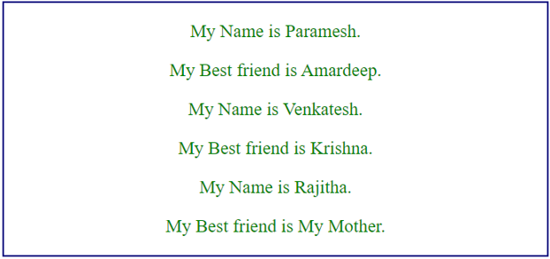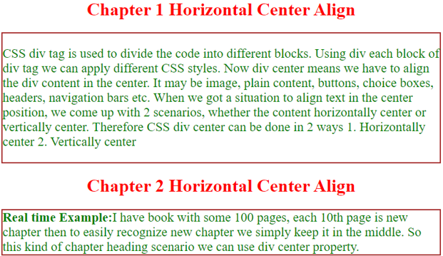 Real-time Example: I have booked some 100 pages; each 10th page is a new chapter. Then to easily recognize a new chapter, we keep it in the middle. So this kind of chapter heading scenario, we can use the div center property.