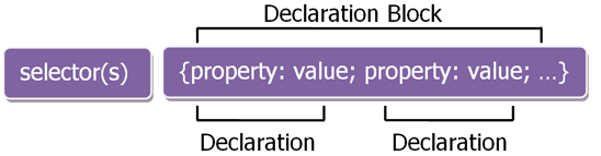1. CSS Syntax: There are a set of rules which need to be followed in CSS Command. The CSS rule set consists of a selector and a declaration block. The selector points to the HTML element the user wants to style. The declaration block can contain one or more declarations that semicolons can separate. Every declaration should include a property name with its value, and colons should separate these.