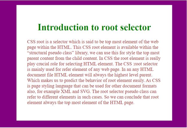 <p> CSS root is a selector which is said to be top most element of the web page within the HTML. This CSS root element is available within the “structural pseudo class” library, we can use this for style the top most parent content from the child content. In CSS the root element is really play crucial role for selecting HTML element. . The CSS :root selector is mainly used for refer <HTML> element of any web page. In an any HTML document file HTML element will always the highest level parent. Which makes us to predict the behavior of root element easily. As CSS is page styling language that can be used for other document formats also, for example XML and SVG. The root selector pseudo class can refer to different elements in such cases. So we can conclude that root element always the top most element of the HTML page.<p>
