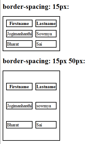 The border-spacing usually takes one or two length values. In this, only one <length> value is specified then it defines both the horizontal and vertical spacing between cells.