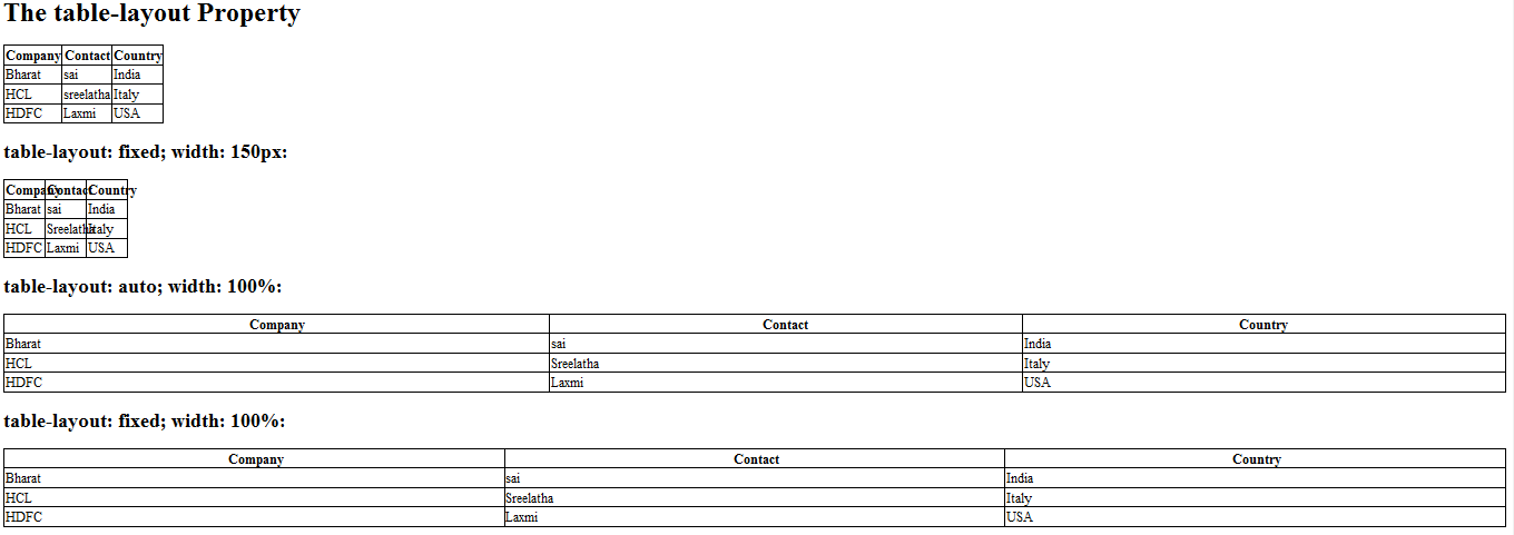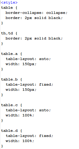 2. Table – layout: fixed: The fixed setting forces the browser to render all columns the same width as the columns in the first row. If the content goes wider than the first row, then the content will be wrapped, cut off, or get extended outside of the cells.