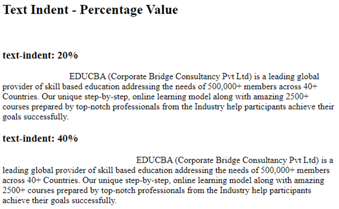 In the above example, we have set text-indent as 20% for the first paragraph, which has moved 20 percentage indentation from the beginning of the text. In the second paragraph, the text will have an indentation of 40% from the beginning.