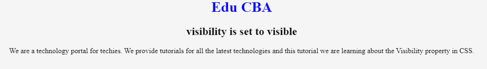 Code Explanation: The above code, when executed in the browser, shows the following output where the text “We are a technology portal for techies. We provide tutorials for all the latest technologies, and this tutorial, we are learning about the Visibility property in CSS.” is hidden: