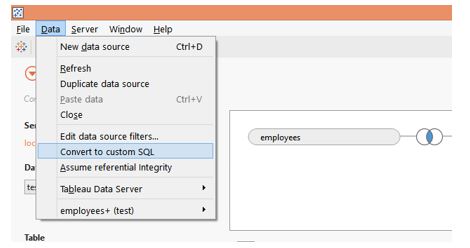 Step 9: We can overcome the redundancy witnessed in the above step using Custom SQL functionality in Tableau. When joining two tables, Tableau generates its own SQL query. Tableau does allow us to work on it. Under the Data tab, Click on the “Convert to custom SQL” option shown in the following screenshot.