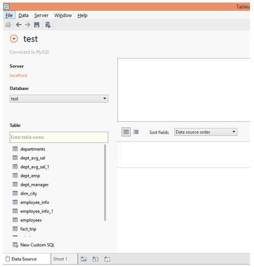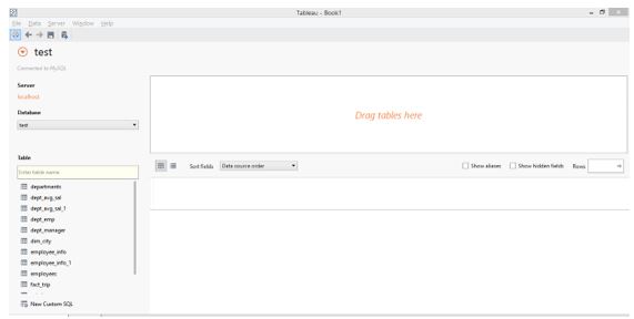 Step 6: When you load the database, the layout in the Data Source resembles the one depicted in the following screenshot. We can directly drag the requisite tables into the “Drag tables here” section.