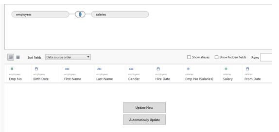 Step 7: We brought tables of employees and salaries into the “Drag tables here” section, and automatically Tableau created a join between the two tables. Note that if Tableau identifies a common field between them, it creates the join.
