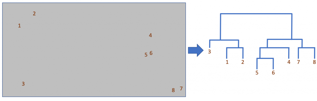 For hierarchical clustering, let us look at how it is done; following that, it will be easier to understand the same intent. When data is taken, the distance of data points is calculated automatically and formulated into a matrix form. Now, once the matrix is calculated, two steps are performed consecutively, the clusters close to each other are identified and then clubbed together. Each step of clubbing became a split node and performed until all are clubbed together. Below a schematic representation using the dendrogram makes it easier to understand.
