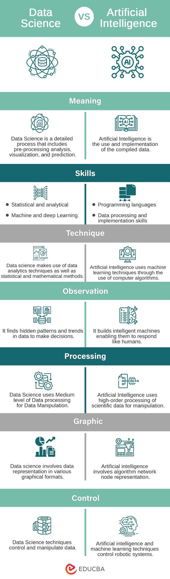- Data Science includes a broad range of statistical methods, whereas AI employs algorithms.