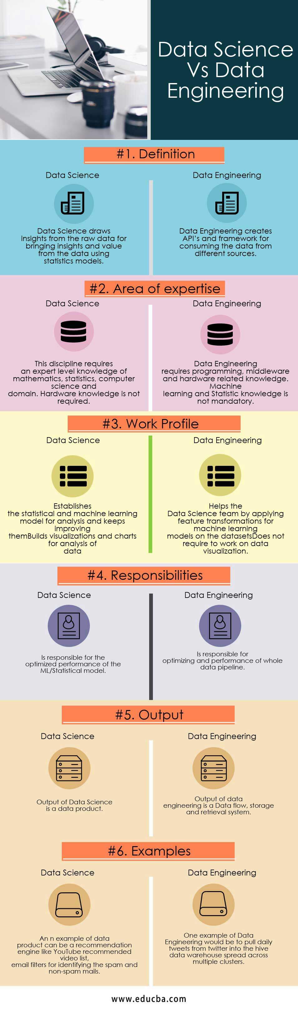 | Definition | Data Science draws insights from the raw data for bringing insights and value from the data using statistical models. | Data Engineering creates API’s and frameworks for consuming data from different sources. |