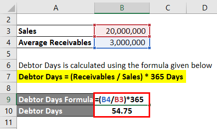 - Debtor Days = (3,000,000 / 20,000,000) * 365