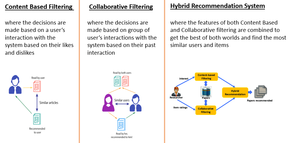 Let’s take a moment to analyze our daily activities. Most of our day begins and continue to progress with our smartphones. From the news, we read to things we shop, and the watch is all recommended to us based on our past choices. In a way, the machines are making decisions on what we might be interested in. This is achieved by building a system that uses techniques as illustrated below,