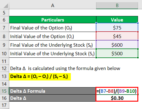 - Delta Δ = ($75 – $45) / ($600 – $500)
