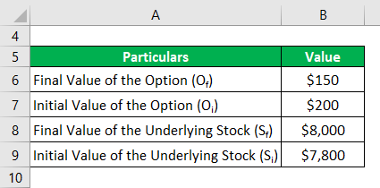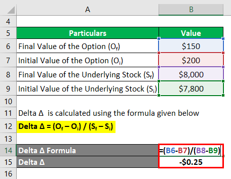 - Delta Δ = ($150 – $200) / ($8,000 – $7,800)