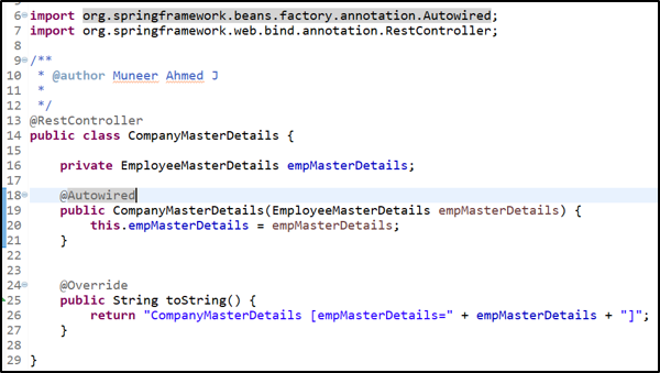 After this, when Spring detects that the EmployeeMasterDetails bean object has been Autowired (using @Autowired) into the CompanyMasterDetails class constructor (line 18), the bean object created for EmployeeMasterDetails will be injected into CompanyMasterDetails class via constructor.