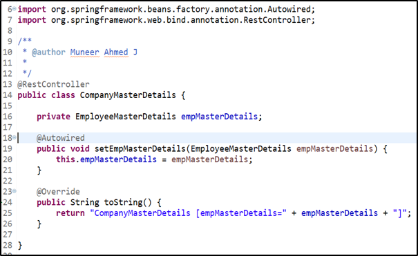 Similar to Constructor-based Dependency Injection, here the Autowiring takes place using the field ‘empMasterDetails‘ at line no.16. The bean object created for EmployeeMasterDetails class will be Autowired & injected via the field ’empMasterDetails’ in CompanyMasterDetails class.