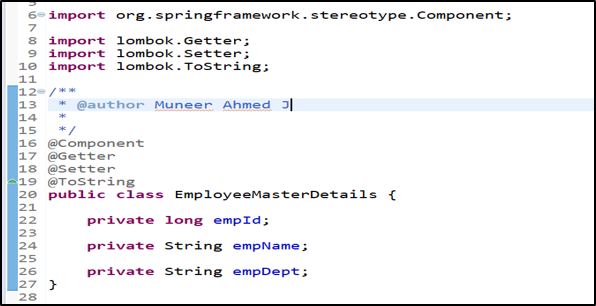 The code creates the EmployeeMasterDetails class as a component using the @Component annotation on line 16. Spring will automatically recognize this during the initialization/booting up of the application & will make a bean object using Bean Factory for EmployeeMasterDetails class.