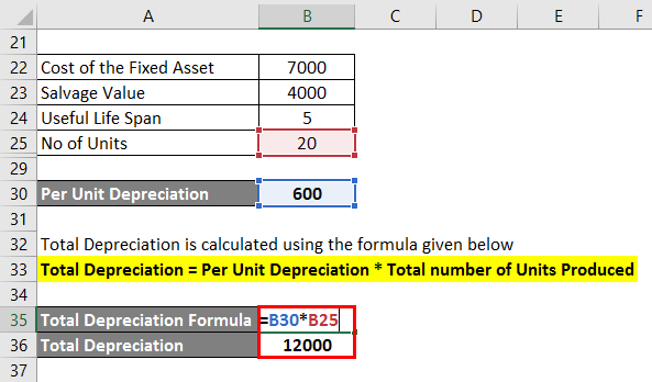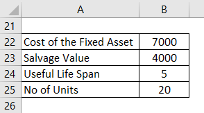 Company X buys equipment for Rs.7000, the useful life of the machinery is 5 years, and the Salvage value of the machinery is Rs.4000. Totally, there are 20 Units of equipment. Now Let us apply the values in the below formula.