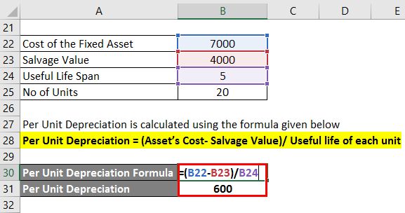 Per Unit Depreciation = (Asset’s Cost – Salvage Value)/ Useful life of each unit