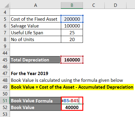 - Step 2: Book value is found by deducting the accumulated depreciation from the asset’s cost. Mathematically, we can apply values in the below equation.