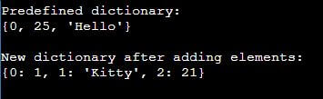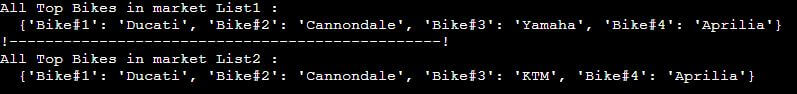 Explanation: In the above example, creating a dictionary involves using an unusual casting method and merging two entities. The program involves collecting values into two separate lists. The first list acts as the dictionary Bikes’ key items; the second list acts as the dict Bikes’ values. The code repeats the above process for different car keys and value lists, fusing both individual lists into a single dictionary item. The code then proceeds to join these individual dictionaries, which zip from a separate list in successive sections. To accomplish this joining process, it utilizes the update() method. It updates the dictionary by adding it as an item to another dictionary element, creating a brand new dictionary that combines the provided dictionary items below.