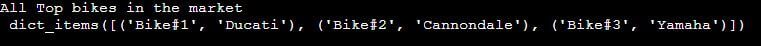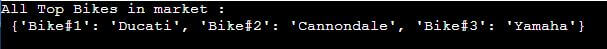 Bikes={'Bike#1':'Ducati','Bike#2':'Cannondale','Bike#3':'Yamaha' }