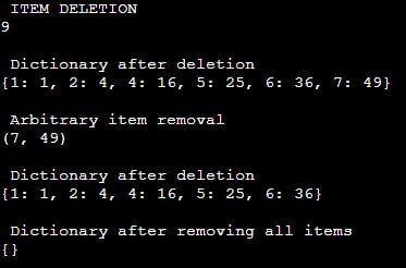 Explanation: The above example involves the dictionary creation process using an unusual and indexed deletion of the dictionary items. The process of deletion is achieved using the popitem() method. Initially, a pop is implied based on the index; next, an undefined pop is implied, which removes the last element in the dictionary; lastly, the entire dictionary is cleaned up using the clear method.