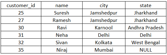 The above query will return each unique city and state combination. In the above case, distinct applies to each field which is written after the distinct keyword. So we will have five pairs of city and state as there Jamshedpur city, which has been repeated twice. So we will have Jamshedpur along with Jharkhand once. The city will be ordered in ascending order. The result set on executing the query is shown below.