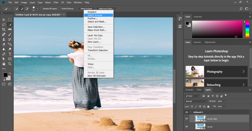 Step 8: Now again, go to Copy of My Pic image layer and make right-click with the mouse button on this image in the display window area. A pop list will be open. Choose the Select Inverse option for inversing your selection from the list.