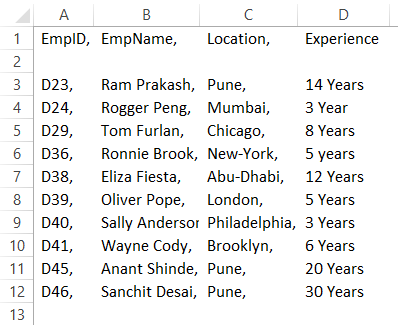 You can see the data which was in a single cell with a comma as a separator or delimiter is now populated across the different columns such as EmpID (column A), EmpName (column B), Location (column C), and Experience (column D).