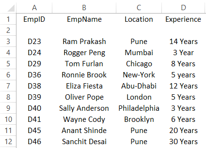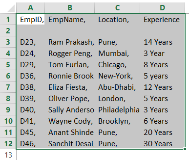 This data set simply consists of EmpID and EmpName, as it seems, and this data has no special delimiter. We need to divide the cells into different columns for both types of data.