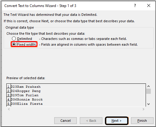 Step 2: As soon as the Convert Text to Columns Wizard gets opened, you need to click the Fixed Width radio button instead of the Delimited (which is set by default). Click on the Next button.