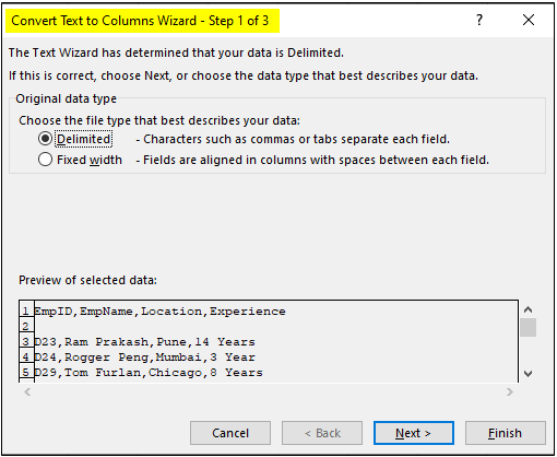 By default, the Delimited option is checked for you. Since our data has a delimiter (comma), we will go with the same selection. Click on the Next > button.