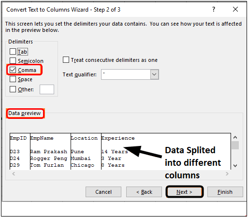 Step 4: Under the Delimiters section, tick the select Comma option (since we have comma-separated data with us). You have different delimiter options such as Tab, Semicolon, Space, etc.; if your data has any delimiter apart from these standard ones, you can use other options to add it as a delimiter for the data to be divided. Since we have a comma, we will use the comma as a delimiter. Once you click on the comma, the cell values are divided into separate columns under the Data Preview section after each comma. Click on the Next button after you are done.