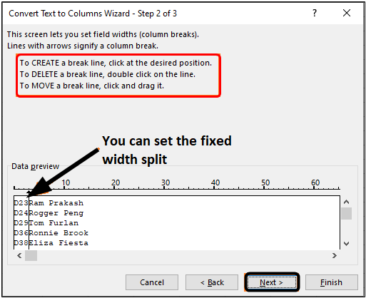 - If the data doesn’t have a delimiter, you can also use the Fixed Width option. However, your data should have a fixed number of characters where a split can happen for that to happen. For Ex. after every third character, you may create a split (as shown in Example 2.)