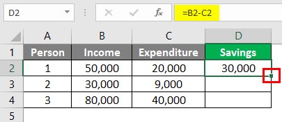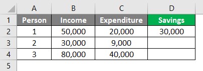 We can even insert or copy one formula to all the below cells using the “Drag and Drop” option. Let’s say we have a dataset where we have income, expenditure, and savings of 3 persons in a month, where savings is calculated as Income minus Expenditure: