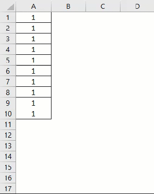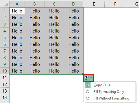 So we can see in the above screenshot that the “Auto-Fill” icon has a dropdown with three options. In the above case, we have dragged and dropped from A1 through D10 by only taking the value from A1.