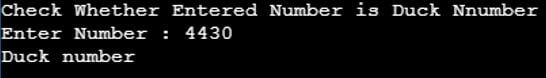 In the above program, it simply checks the number by using the Boolean Function; in that function itself, we check whether the passing number is ‘duck value’ in this program itself, we initialized the input_value that number is passed to the bool function based on the condition it returns either true or false. In the main function (), we called only the Boolean function To_Check_DNumber(inputValue); it displays “Duck Number” it condition is true.