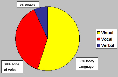 As per the diagram above we consider that any effective communication has 55% importance to body language, 38% to the voice tone and the remaining 7% to the usage of words. Hence one has to be equally careful about the non-verbal signals being sent to others. Mostly we do not pay much attention to how something is being said as we only focus our mind on what has to be said.
