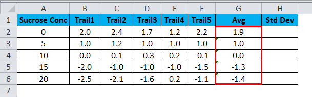Consider the same example where we have already calculated the Standard deviation as shown in the screenshot below showing chemistry labs test trails with average and standard deviation.