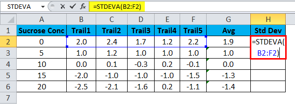 - Now calculate the Standard Deviation by using the formula =STDEVA(B2:F2)