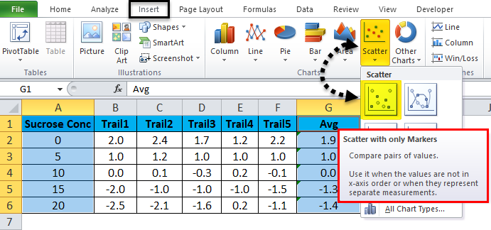 - Go to the Insert menu. Select the Scatter Chart that needs to be displayed. Click on the scatter chart.