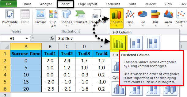 - First, select the Sucrose Concentration column and Standard deviation Column.