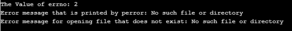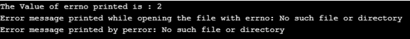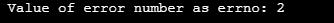 In the above program, we are trying to open a file that does not exist, and hence it will give an error that has been assigned a value and it is errno 2.