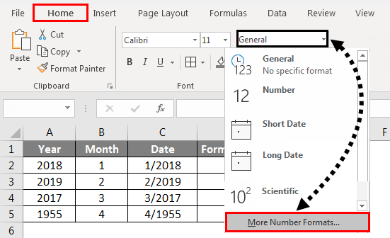 Step 5: Now go to the Number section in the Home Tab and click on the dropdown next to General to select More Number Formats.