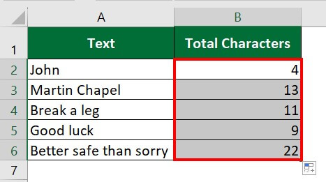 In “=LEN(text)”, the text refers to the cell value you want to count the characters.