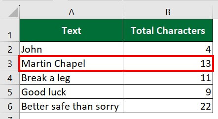 The LEN function returns “13” for the text in cell A3, whereas the actual character count is “12“; see the below image.