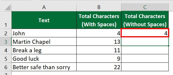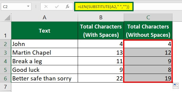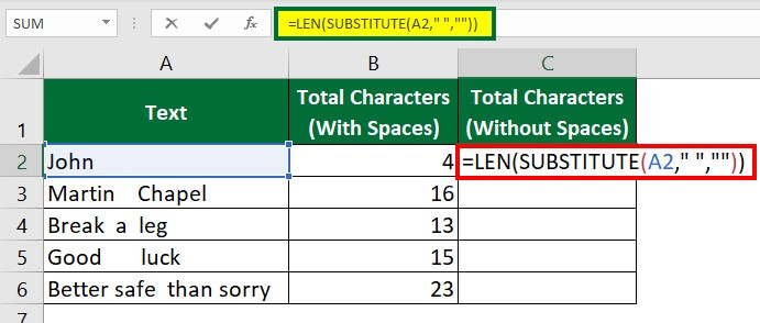 The SUBSTITUTE function will replace the space character (““) in Cell A2 with empty text (“). So, the formula won’t count the spaces.