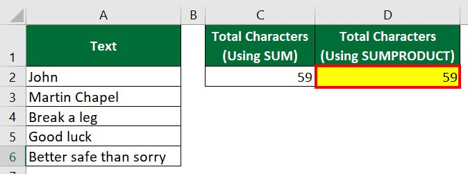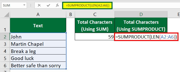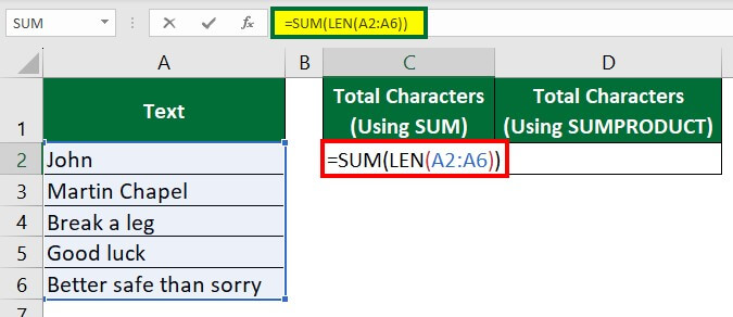 Consider the below example; here, we will calculate the total number of characters in column A using two combinations of functions. First, we will use the SUM and LEN functions, and then the SUMPRODUCT and LEN functions.