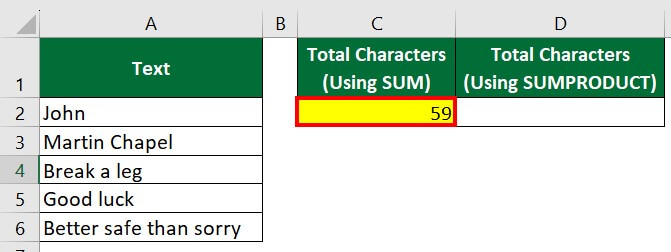- After then, the “SUM” function adds all numbers and returns the total character count, i.e., 59.